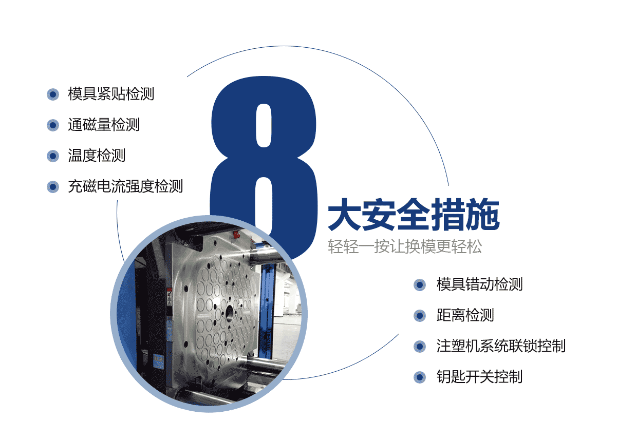 • 電永磁磁力模板大大提高注塑機(jī)換模效率。 自動(dòng)化注塑機(jī)的換模方法僅需3分鐘即可完成。特大型注塑機(jī)模板的換模時(shí)間從超過(guò)2小時(shí)減少到10分鐘。